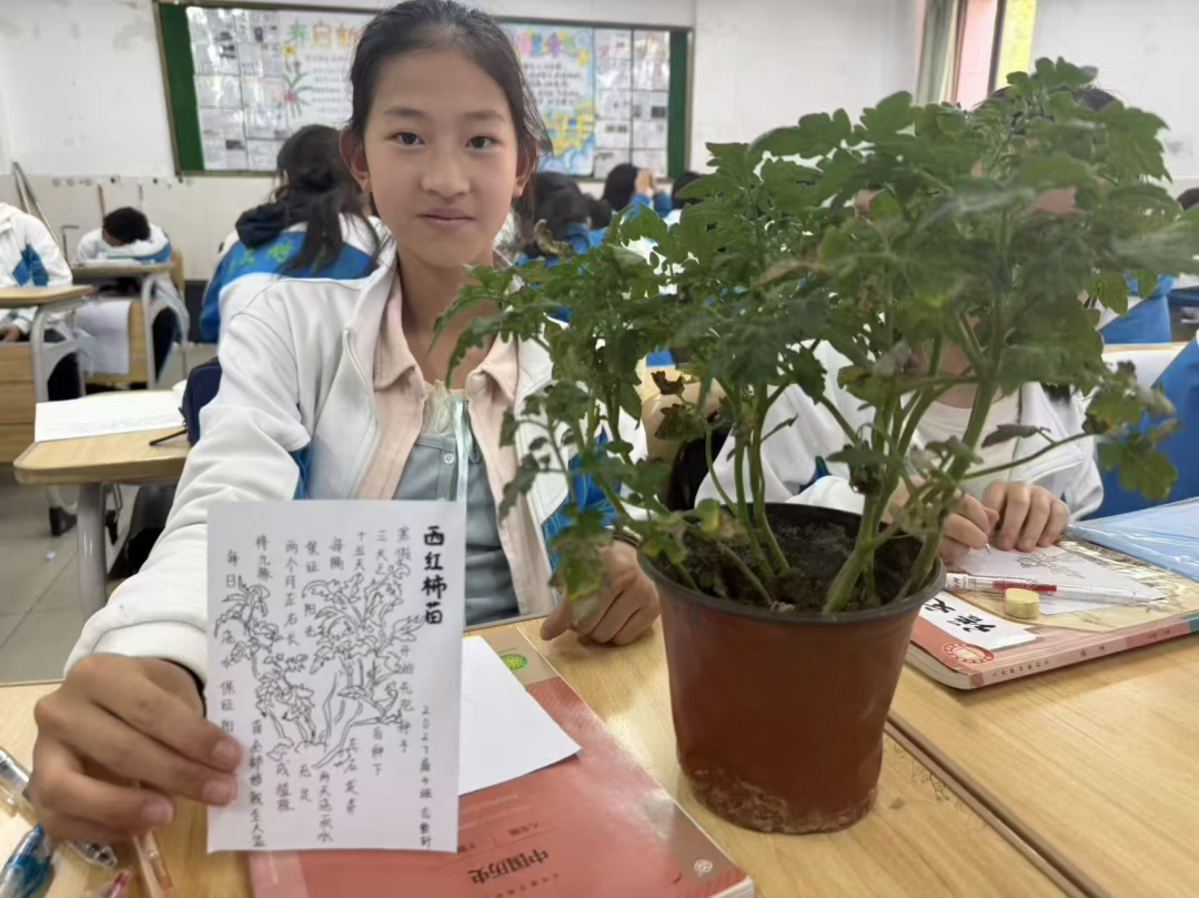 活动伊始,学生代表依次分享假期种植探究感悟,郝辰熙同学以《向阳而生的力量——我在阳台种韭菜》为题,讲述了自己种植韭菜时从烂根受挫到掌握养护技巧的经历,将种植中的“养根”“再生”与学习成长中的坚持、抗挫相联结,道出劳动实践中的人生感悟;八年级九班王坤泽、谢添丞同学则结合辣椒苗移栽实操,分享了带土移栽的实践思考,将初中生物课本中根尖、根毛的理论知识与实操求证相结合,深刻诠释了“纸上得来终觉浅,绝知此事要躬行”的实践意义,让现场师生感受到实践探究的魅力。