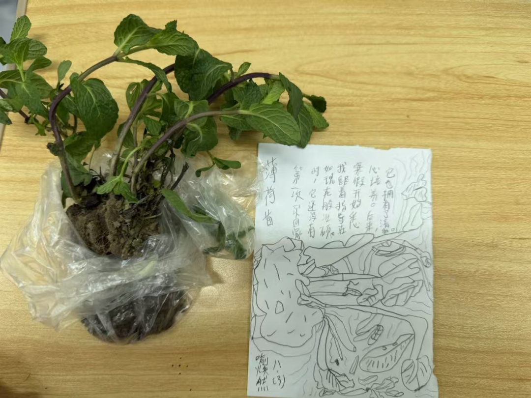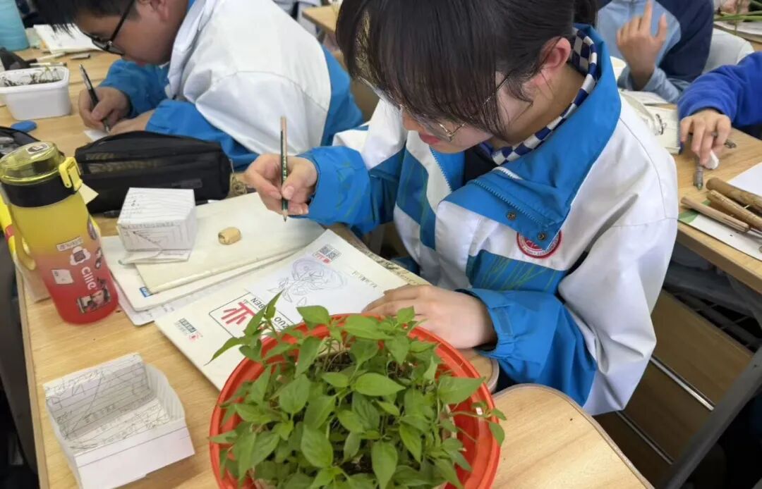 移栽实操环节,同学们以小组为单位,严格按照移栽标准,小心翼翼起苗、挖坑、放苗、覆土、压实,每一个步骤都细致认真,将假期培育的幼苗稳稳移栽至耘知园的沃土中。摄影社师生全程跟进,用镜头定格同学们躬身实践、呵护幼苗的精彩瞬间,记录下这场充满生机的植绿之旅;与此同时,绘画社师生在课堂开展幼苗写真速写活动,同学们以画笔勾勒自己精心培育的幼苗形态,将亲手耕耘的成果与自然之美融入笔墨之间,让劳动实践与美术创作有机结合。三社各司其职、同步联动,让本次移栽活动成为一场融合劳动、生物、摄影、美术的综合素养提升实践课。