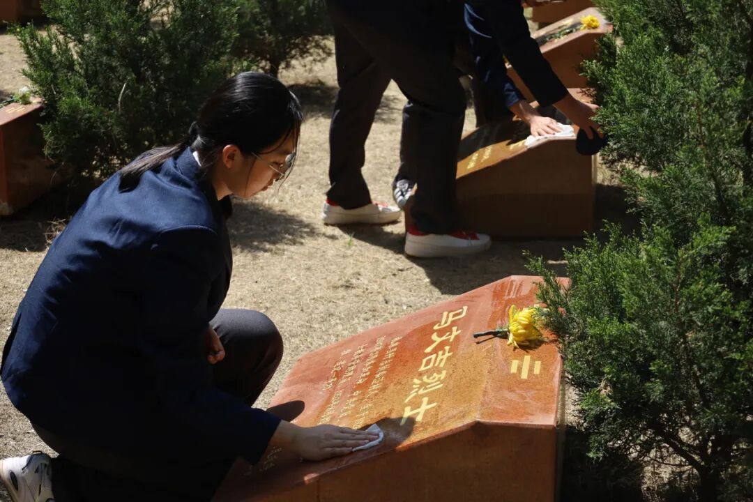 同学们化身志愿守护者,拿起抹布、扫帚等清洁工具,分工协作、认真细致地打扫陵园,擦拭墓碑与纪念碑,清理落叶尘土,用实际行动守护先烈的安息之地,在躬身实践中感悟革命精神,让爱国情怀落地生根。